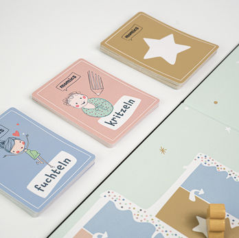 Die Kritzel-, Fuchtel- und Wissenskarten bringen euch durch richtige Antworten immer näher Richtung Tortentopper. Dafür haben eure Teams abwechselnd 1 Minute Zeit. Die Zeit stoppt ihr mit einer dem Spiel beigelegten Stoffspieluhr, die später dem Baby beim Einschlafen helfen kann.